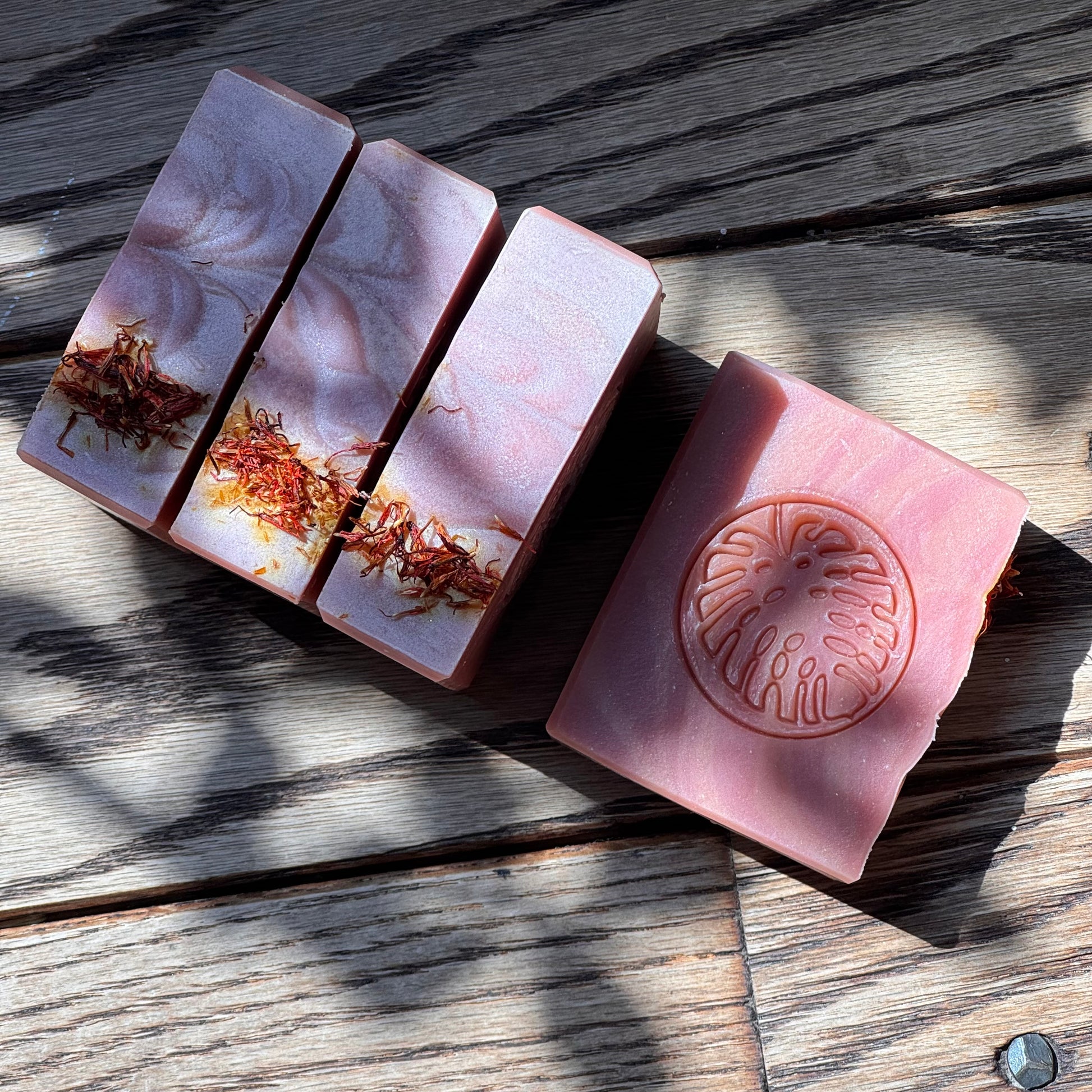 Coconut Oil*, Olive Oil, Shea Butter*, Kokum Butter*, Castor Oil, High Oleic Sunflower Oil, Distilled Water, Sodium Hydroxide, Geranium, Atlas Cedarwood, Bergamot, Rosemary, + Black Pepper Essential Oils, Sodium Lactate, Kaolin Clay, Ethically Sourced Mica, Dried Safflower. Vegan.
